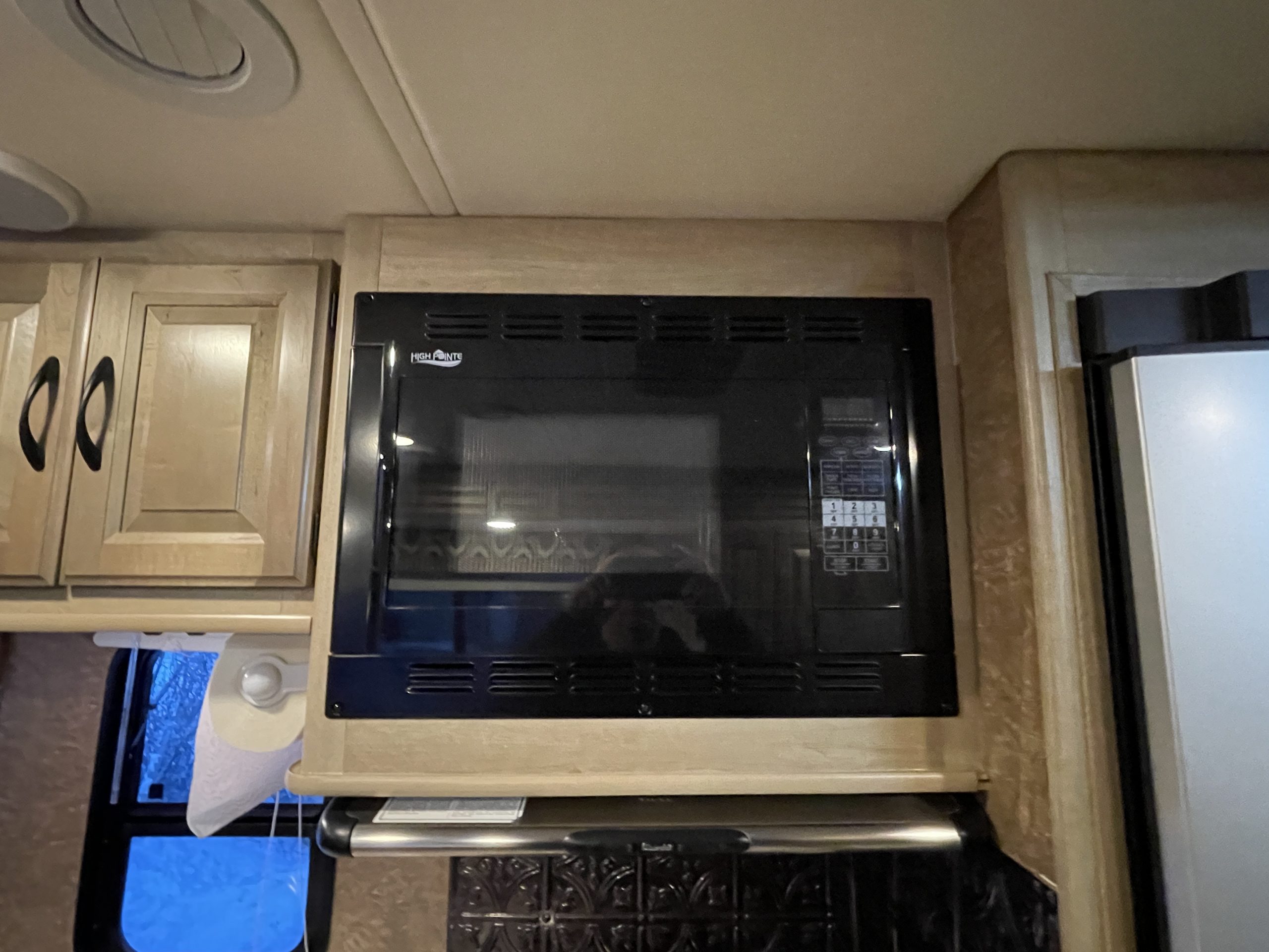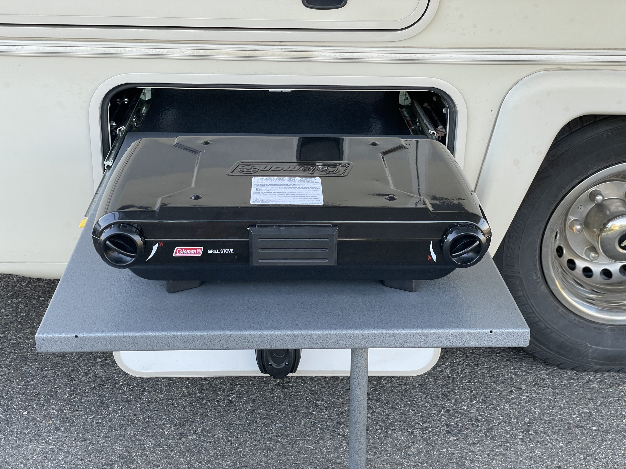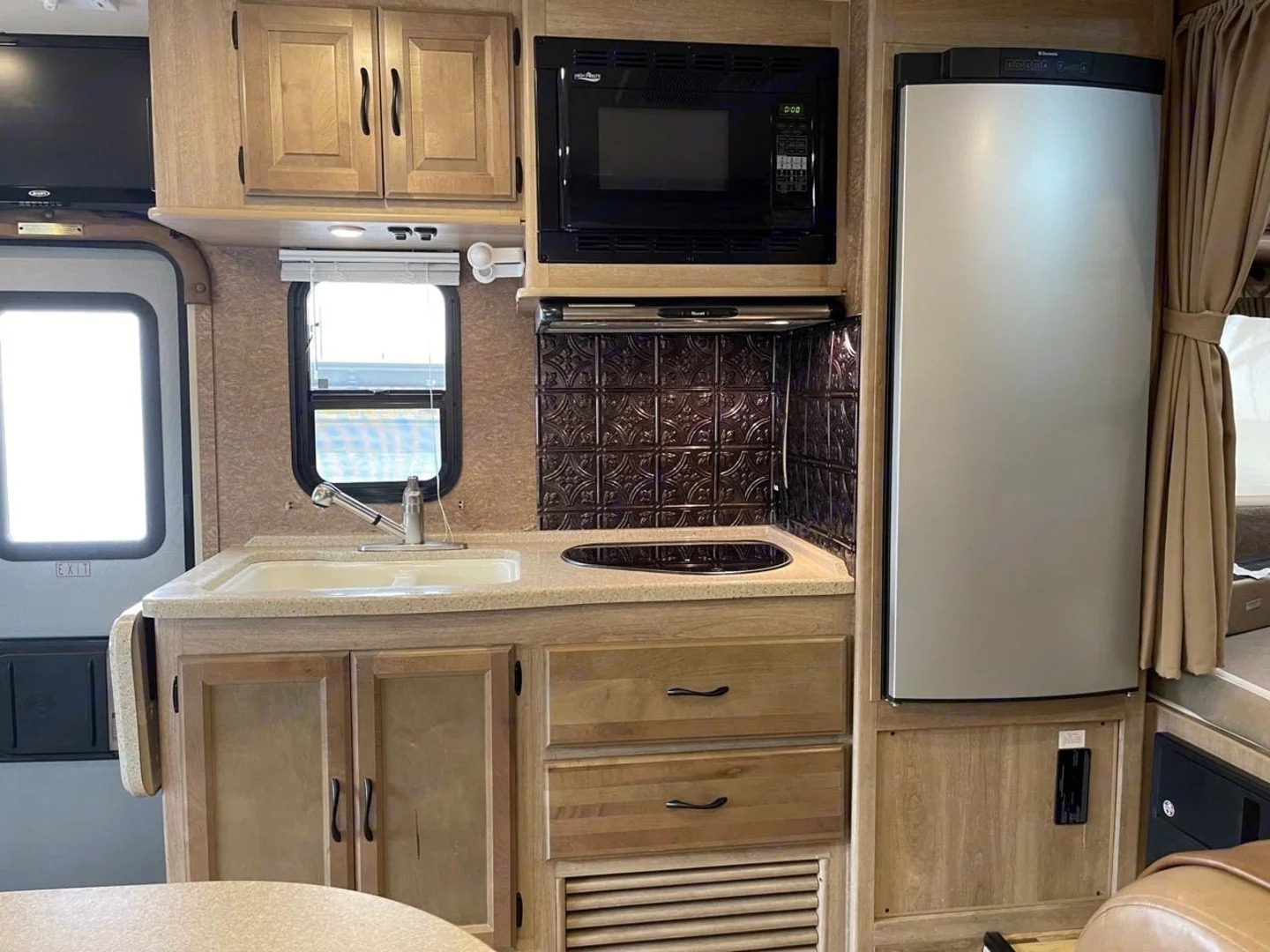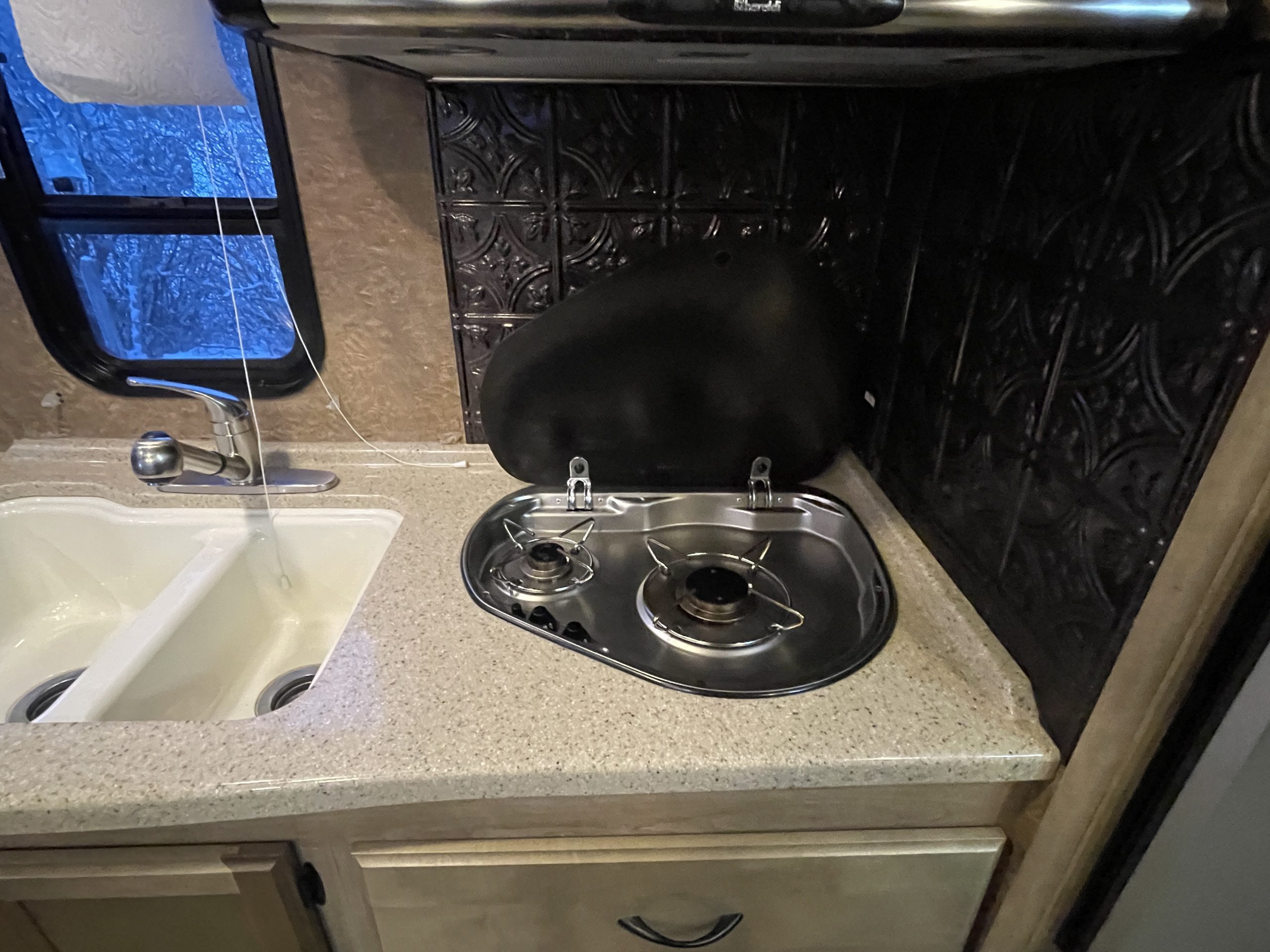 - Two-burner propane cooktop and convection microwave for easy meal prep.
