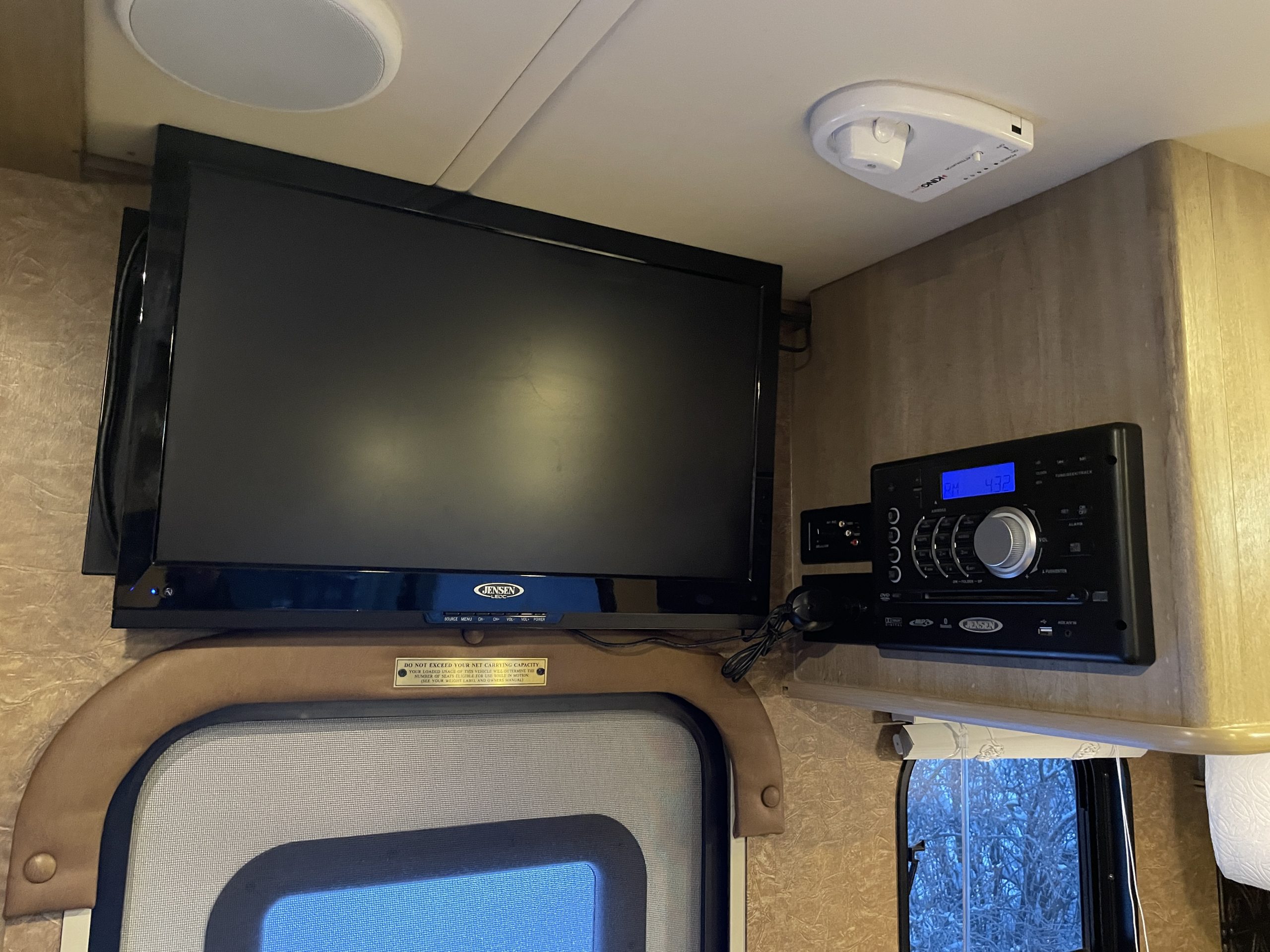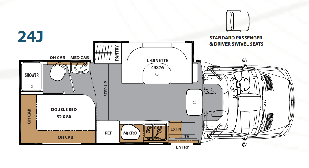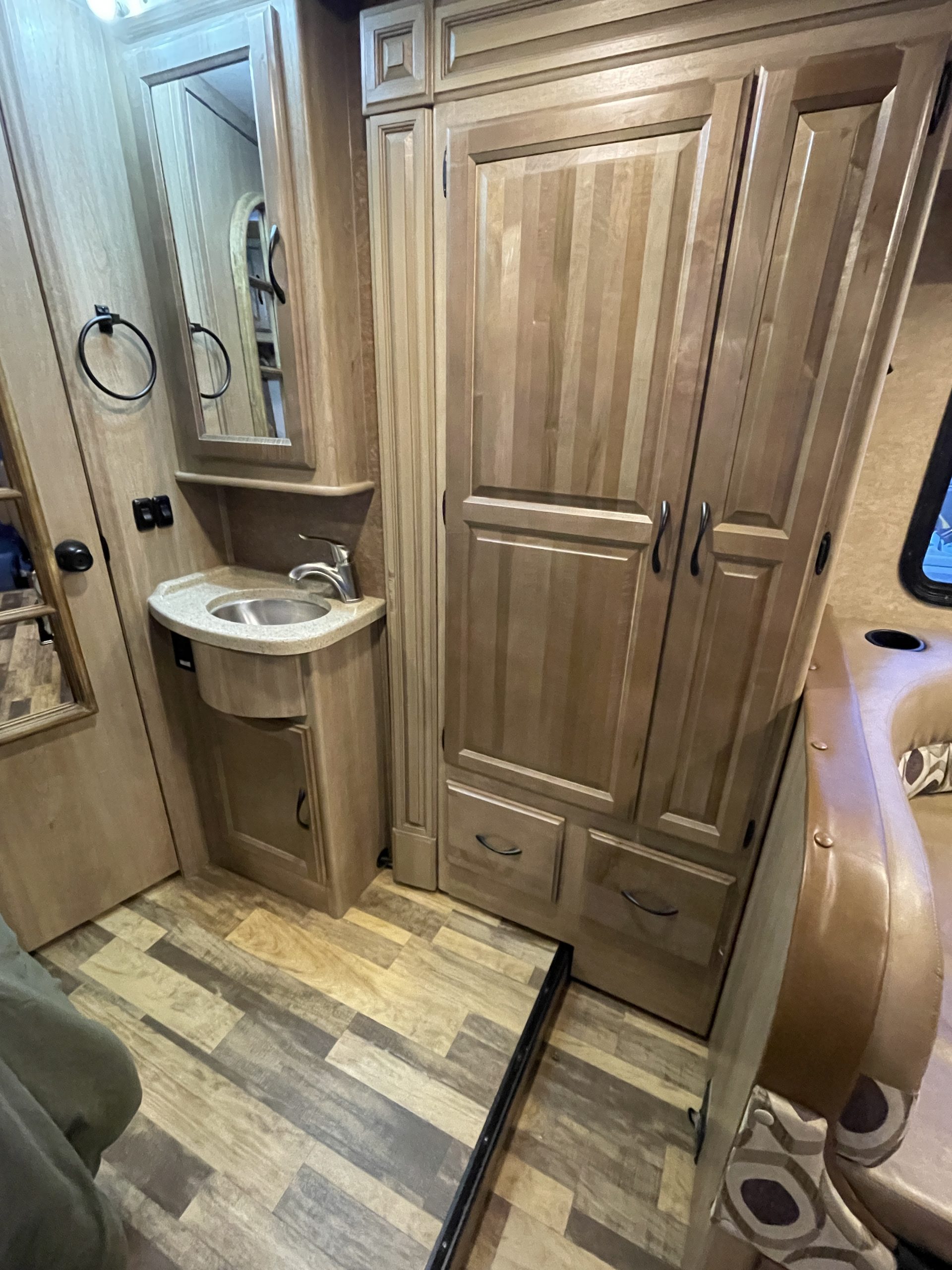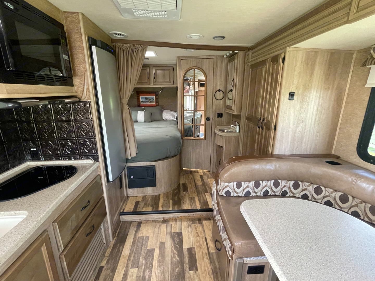 - Two-burner propane cooktop and convection microwave for easy meal prep.